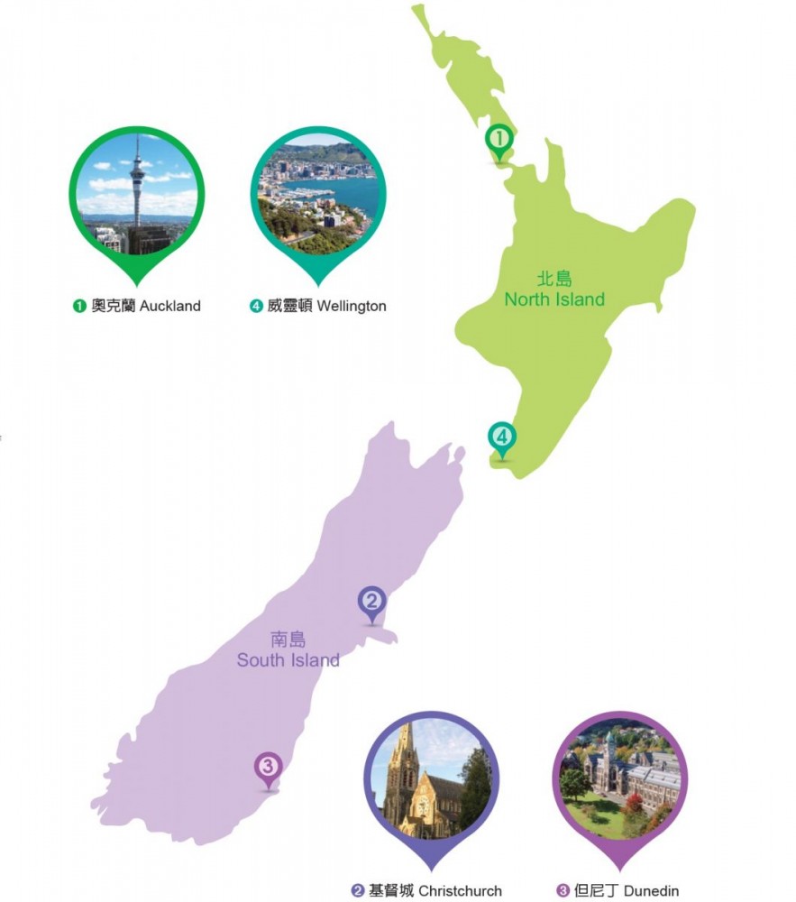 新西蘭約有400多所中學 ,分佈南北島各地區 ,大多數為政府中學,但其中也有私立學校和教會資助津貼中學。所有學校皆受政府的教育條例監管,此外,所有招收海外學生的學校都要遵守政府為保障海外生利益而設的條例--code of practice:每所招收海外學生的學校都需設有英文輔導班,並需提供海外學生事務專員跟進海外生的住宿、學業或生活上的問題。新西蘭的中學課程跟澳門很相似,一般包括、社會、科學、數學、音樂、美術、工藝及體育等科目。學生必須根據全國統一的NCEA (National Certificate Of Educational Achievement)標準修讀所需學分:第十一班須完成NCEA第一級的八十個學分,第十二班須完成NCEA第二級的六十個學分及其他級別的二十個學分,第十三班須完成NCEA第三級的六十個學分及二十個二級或以上的學分。各大學根據學生NCEA的成績考慮是否接納他們的入學申請。